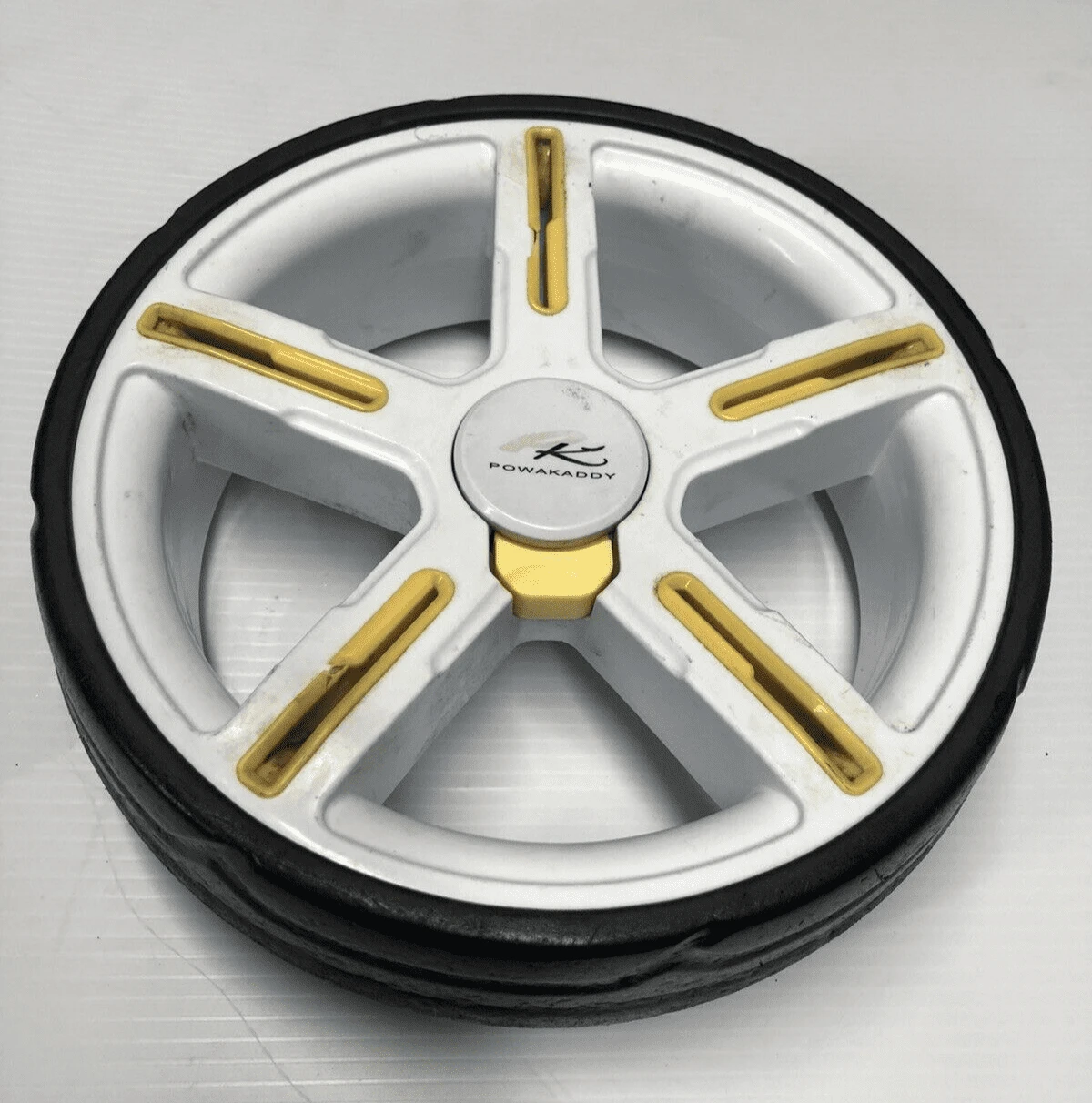These wheels have been inspected cleaned and re-sprayed . This is a replacement quick release wheel for your PowaKaddy golf trolley. It will fit any Powakaddy electric golf trolley that has detachable clutches (some of the older Powakaddys had wheels with built in clutches) and you can fit it to either side of your trolley using your existing clutches. If you are not sure if this wheel will fit your trolley, please contact us and we will be pleased to advise you. i [email protected]
